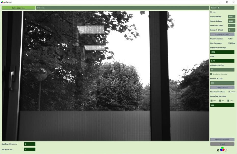 Die intuitive Benutzeroberfläche ermöglicht ein einfaches Umschalten zwischen den Live-Ansichten verschiedener Kameras oder eine Einstellung verschiedener Kamerasteuerungsfunktionen wie ROI, Belichtungszeit, Verstärkung, Bildrate. Auch die Einstellung des Dateipfades, der Videodauer sowie Bildanpassungen, der Wechsel zwischen komprimierter und unkomprimierter Aufzeichnung oder eine Verwendung von Hardwaretriggern sind einfach möglich.