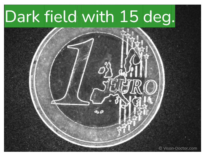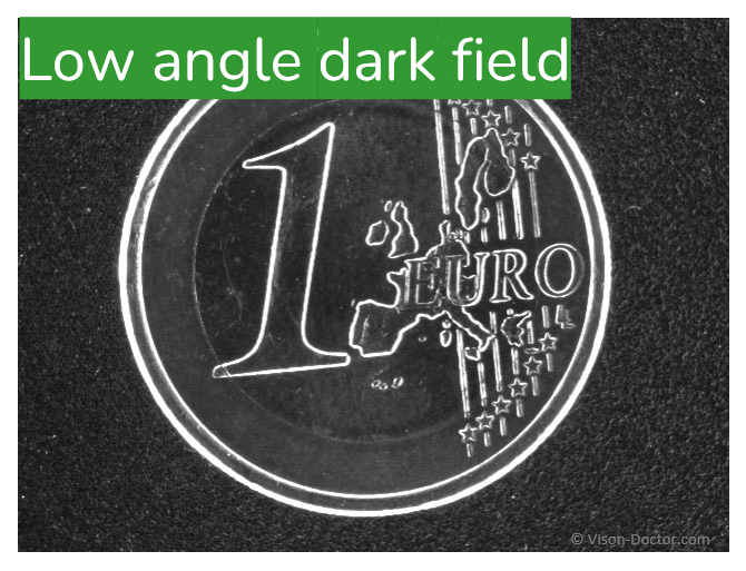 The principle: the part is illuminated at a very shallow incidence angle, most of the light is reflected away from the camera by the smooth surface, so the surface appears nearly dark.